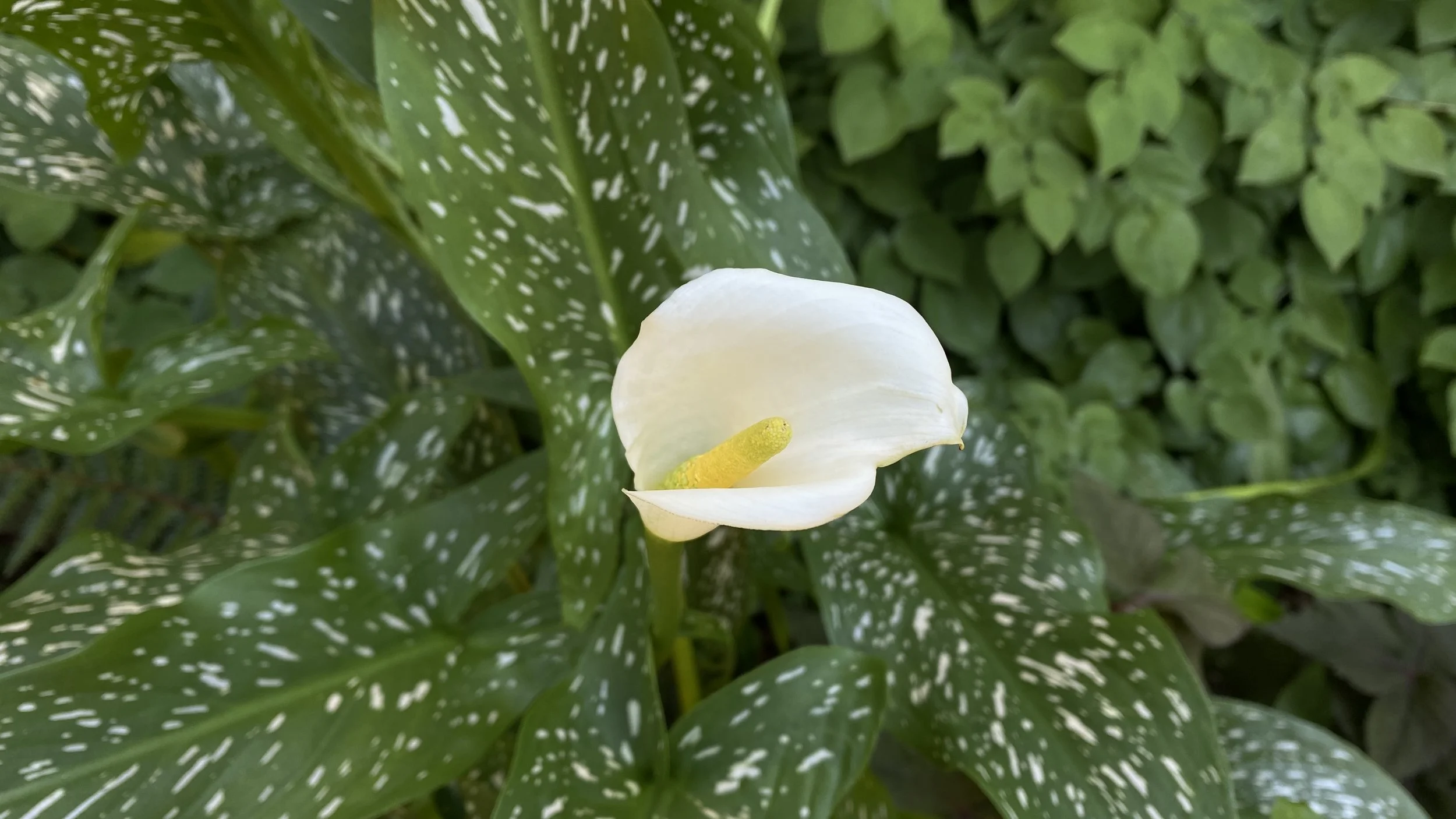Zantedeschia albomaculata blooms just behind the house, near the enclosed terrace.
