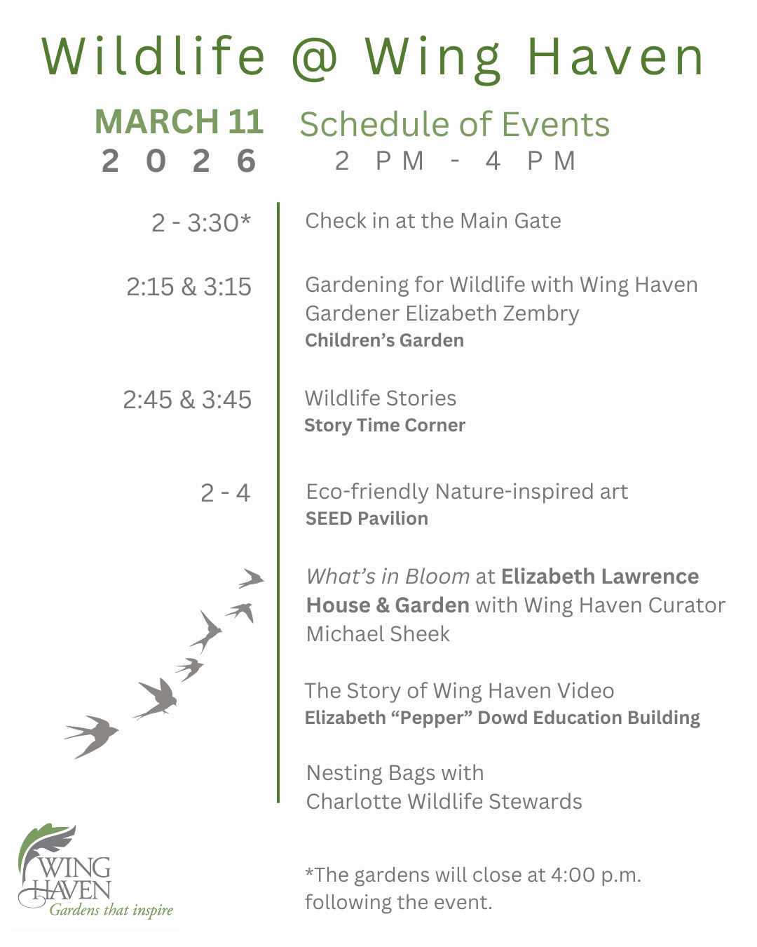 Come celebrate backyard wildlife at Wing Haven, a Certified Wildlife Habitat. Learn about the benefits of attracting wildlife to your backyard from our community partners and leave feeling inspired to create your own certified wildlife habitat.