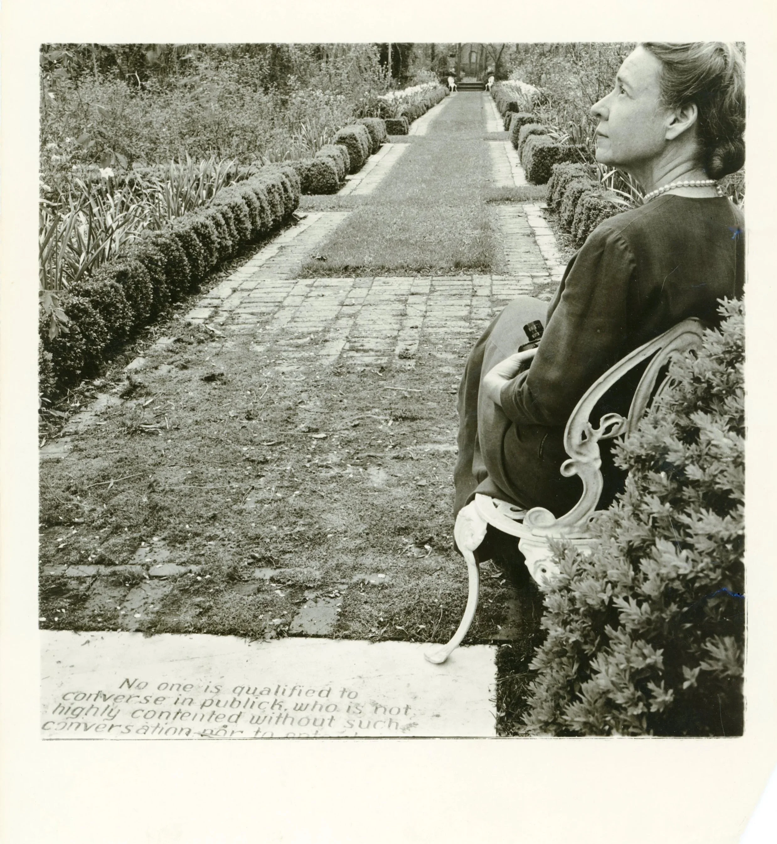 Elizabeth Clarkson sits in her garden to enjoy the birds and blooms. Circa 1950s.